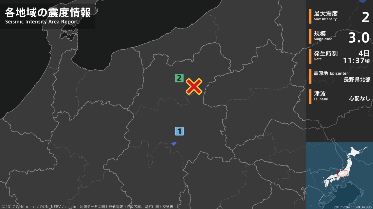 【地震情報 2017年11月4日】11時37分頃、長野県北部を震源とする地震がありました。震源の深さは約10km、地震の規模はM3.0、最大震度2を長野県で観測しています。この地震による津波の心配はありません。#地震 #長野県