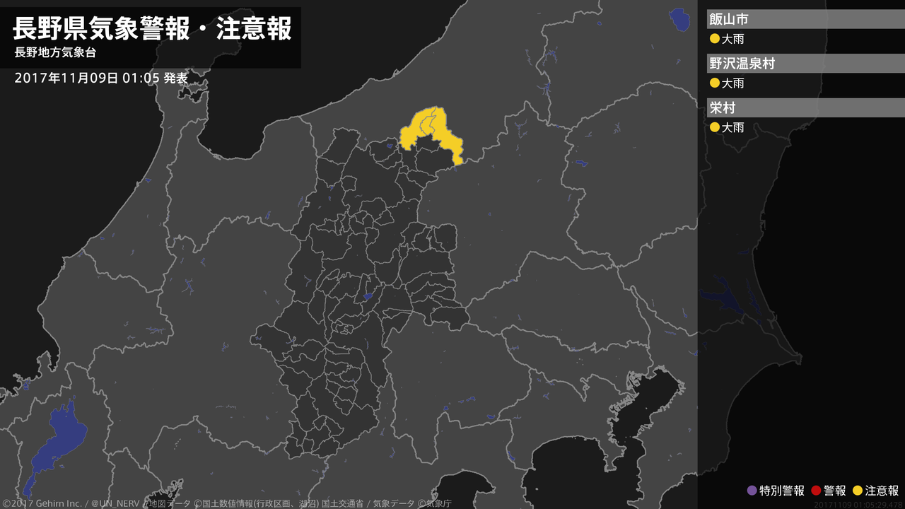 【長野県 気象警報・注意報 2017年11月09日 01:05】北部では、9日昼前まで土砂災害に注意してください。#気象警報注意報 #長野県