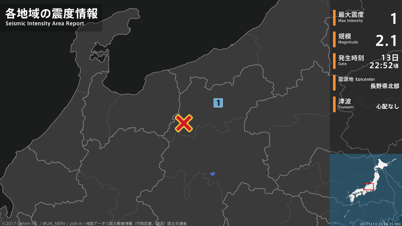 【地震情報 2017年11月13日】22時52分頃、長野県北部を震源とする地震がありました。震源の深さは約10km、地震の規模はM2.1、最大震度1を長野県で観測しています。この地震による津波の心配はありません。#地震 #長野県