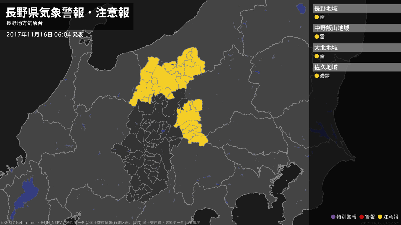 【長野県 気象警報・注意報 2017年11月16日 06:04】北部では、16日夕方まで急な強い雨や落雷に注意してください。中部では、16日昼前まで濃霧による視程障害に注意してください。#気象警報注意報 #長野県