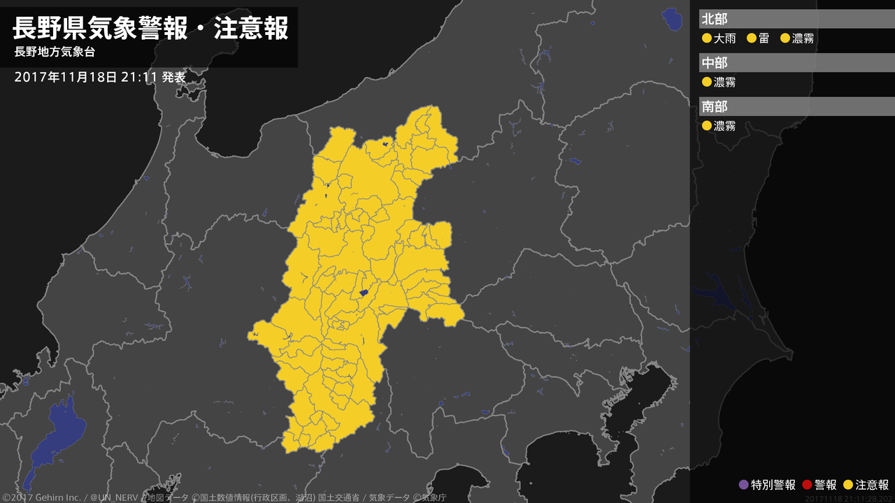 【長野県 気象警報・注意報 2017年11月18日 21:11】北部では、土砂災害や落雷に注意してください。長野県では、濃霧による視程障害に注意してください。#気象警報注意報 #長野県