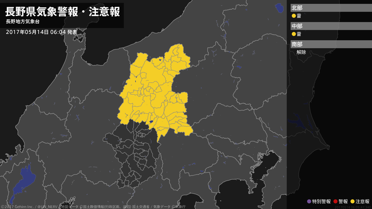 【長野県 気象警報・注意報 2017年05月14日 18:12】北部、中部では、14日夜遅くまで急な強い雨や落雷に注意してください。中部では、14日夜遅くから15日昼前まで濃霧による視程障害に注意してください。#気象警報注意報 #長野県