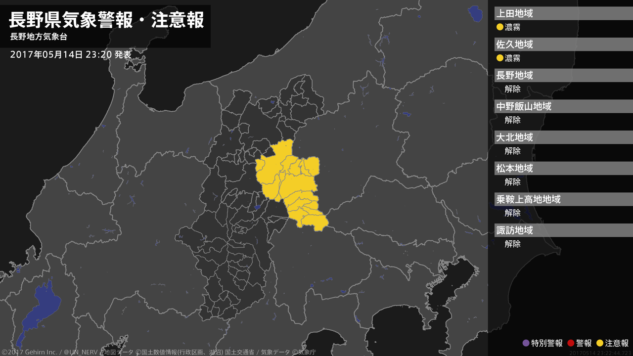 【長野県 気象警報・注意報 2017年05月14日 23:22】中部では、15日昼前まで濃霧による視程障害に注意してください。#気象警報注意報 #長野県