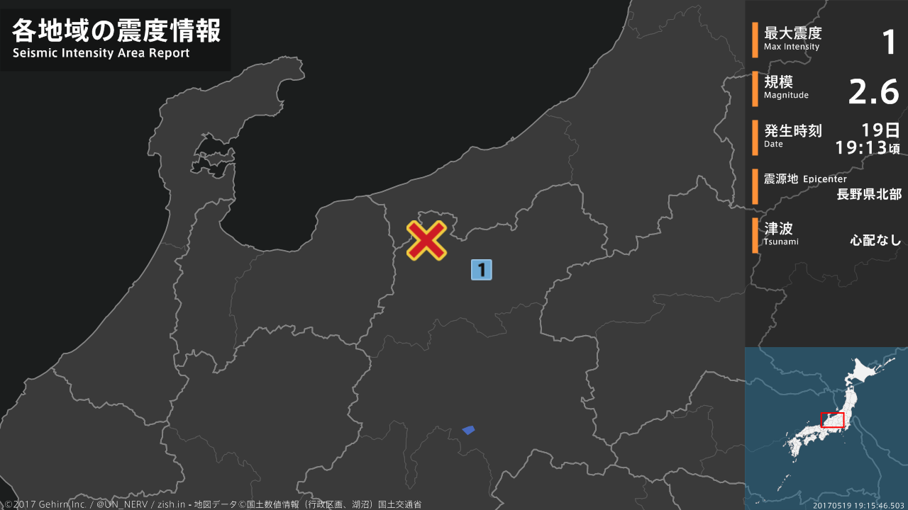 【地震情報 2017年5月19日】19時13分頃、長野県北部を震源とする地震がありました。震源の深さは約10km、地震の規模はM2.6、最大震度1を長野県で観測しています。この地震による津波の心配はありません。#地震 #長野県