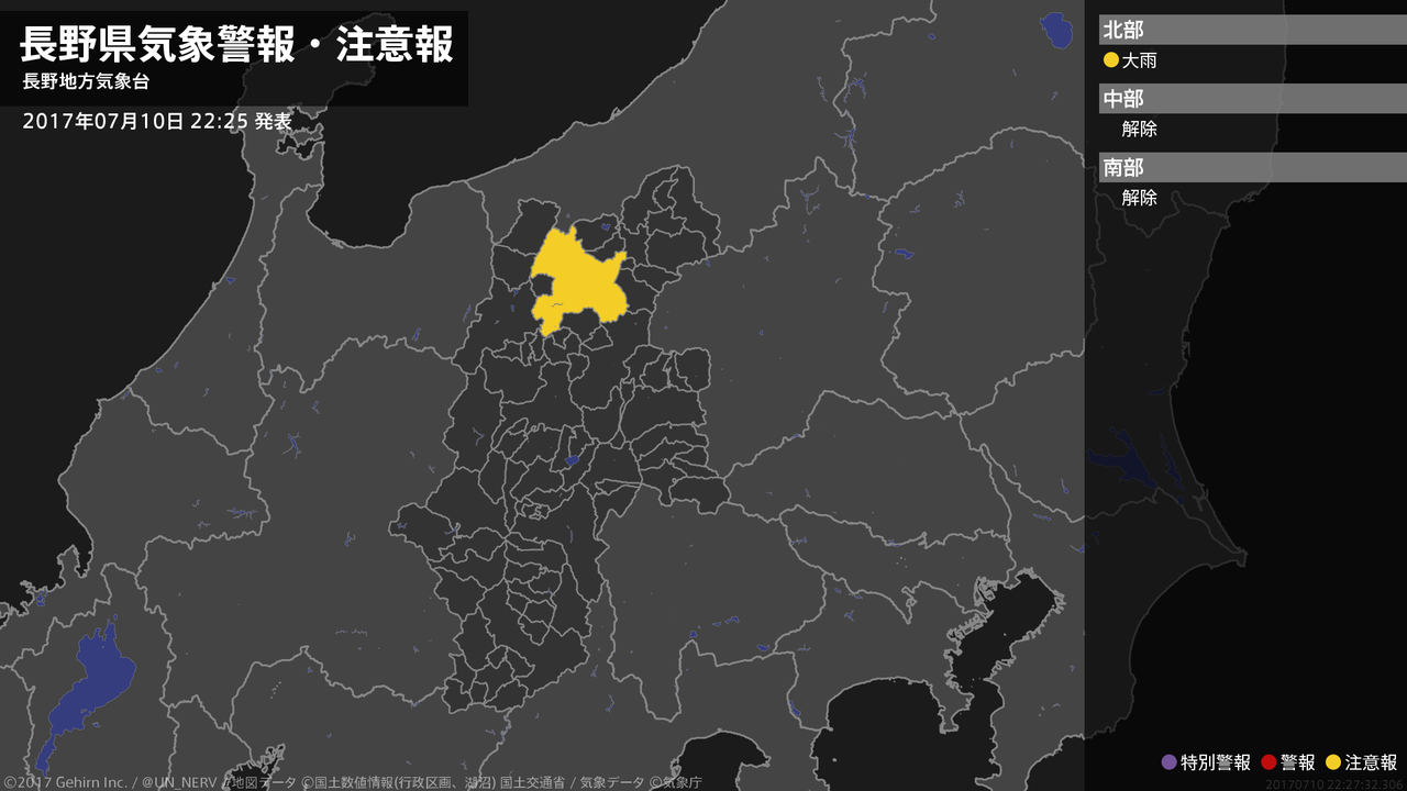【長野県 気象警報(解除) 2017年07月10日 22:27】長野県に発表されていた気象警報はすべて解除されました。北部では、11日明け方まで土砂災害に注意してください。#気象警報 #長野県