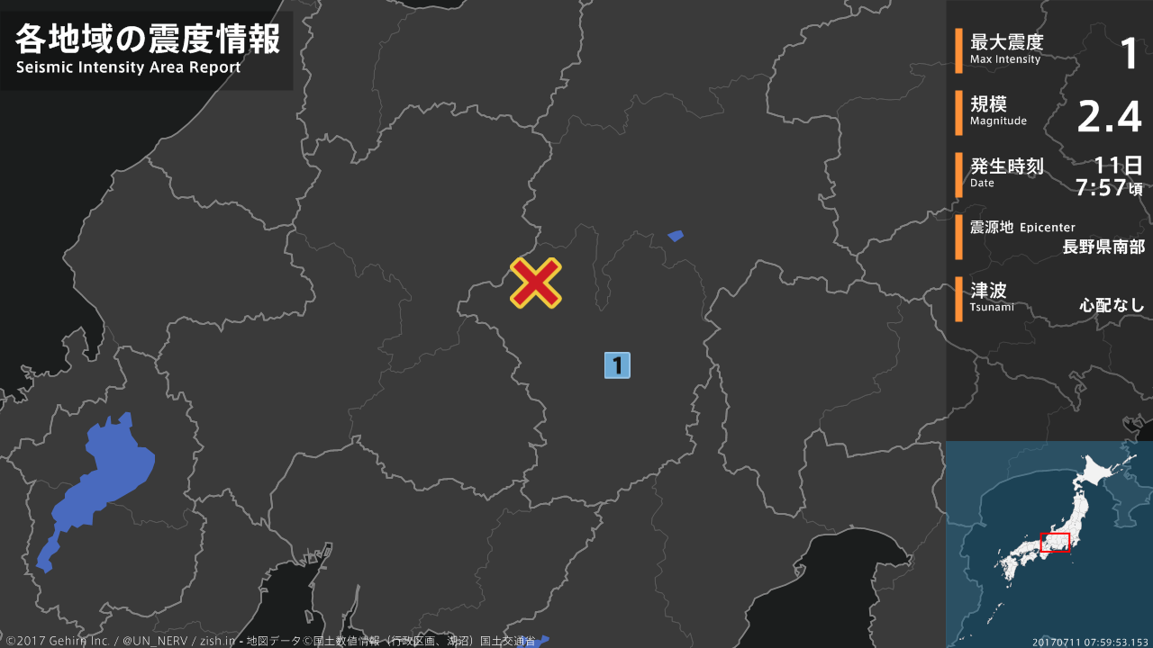 【地震情報 2017年7月11日】07時57分頃、長野県南部を震源とする地震がありました。震源の深さは約10km、地震の規模はM2.4、最大震度1を長野県で観測しています。この地震による津波の心配はありません。#地震 #長野県