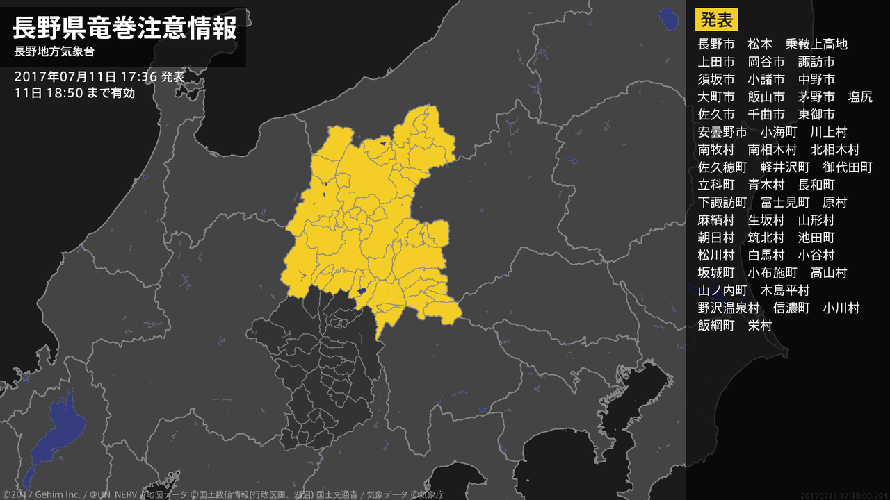 【長野県 土砂災害警戒情報 2017年07月11日 18:46】長野県の警戒対象地域では土砂災害の危険度が高まっています。身の安全を確保するよう努めてください。#土砂災害警戒情報 #長野県