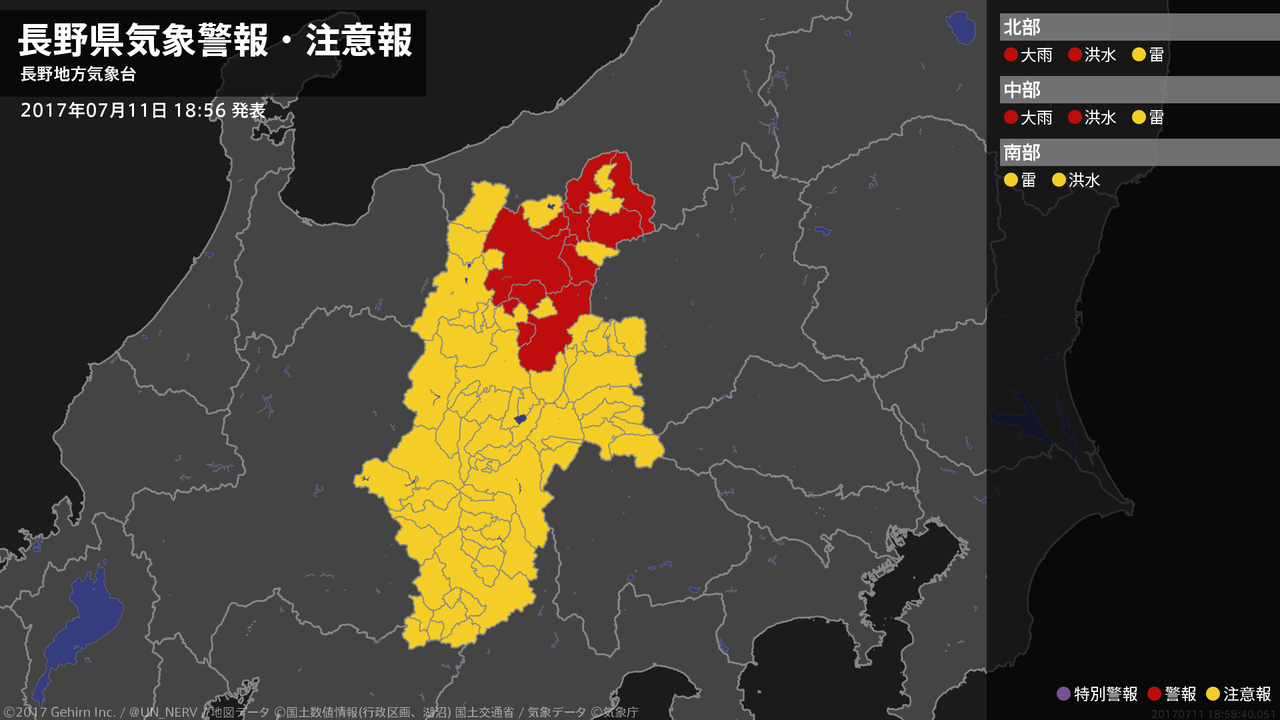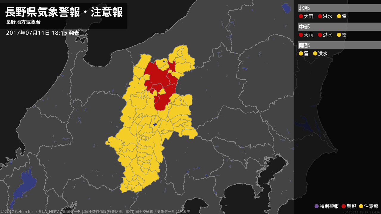 【長野県 気象警報 2017年07月11日 17:58】北部、中部では、11日夜のはじめ頃まで低い土地の浸水や河川の増水に警戒してください。#気象警報 #気象警報注意報 #長野県