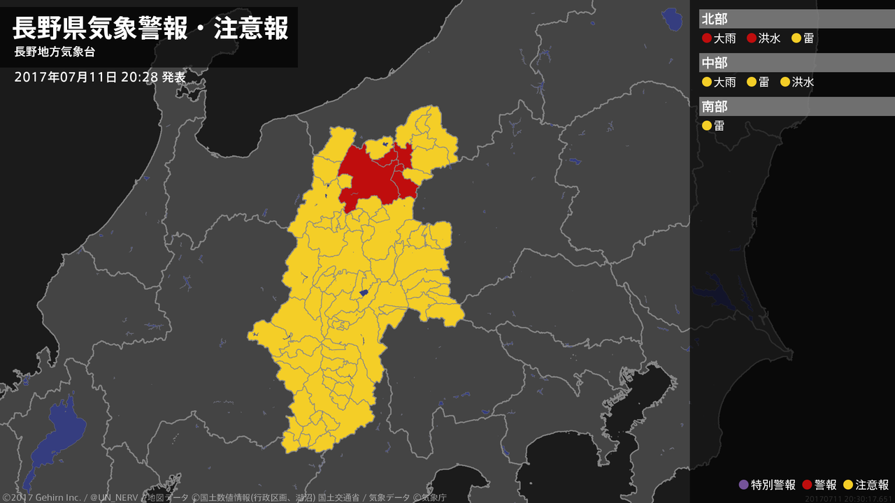 【長野県 気象警報 2017年07月11日 20:30】北部では、11日夜遅くまで土砂災害や河川の増水に警戒してください。#気象警報 #気象警報注意報 #長野県