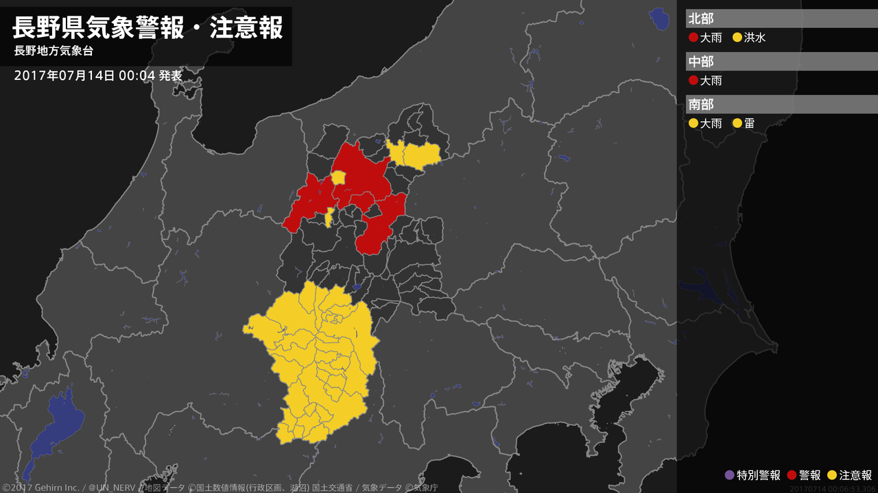 【長野県 気象警報 2017年07月14日 00:06】中部では14日未明まで、北部では14日明け方まで、土砂災害に警戒してください。#気象警報 #気象警報注意報 #長野県