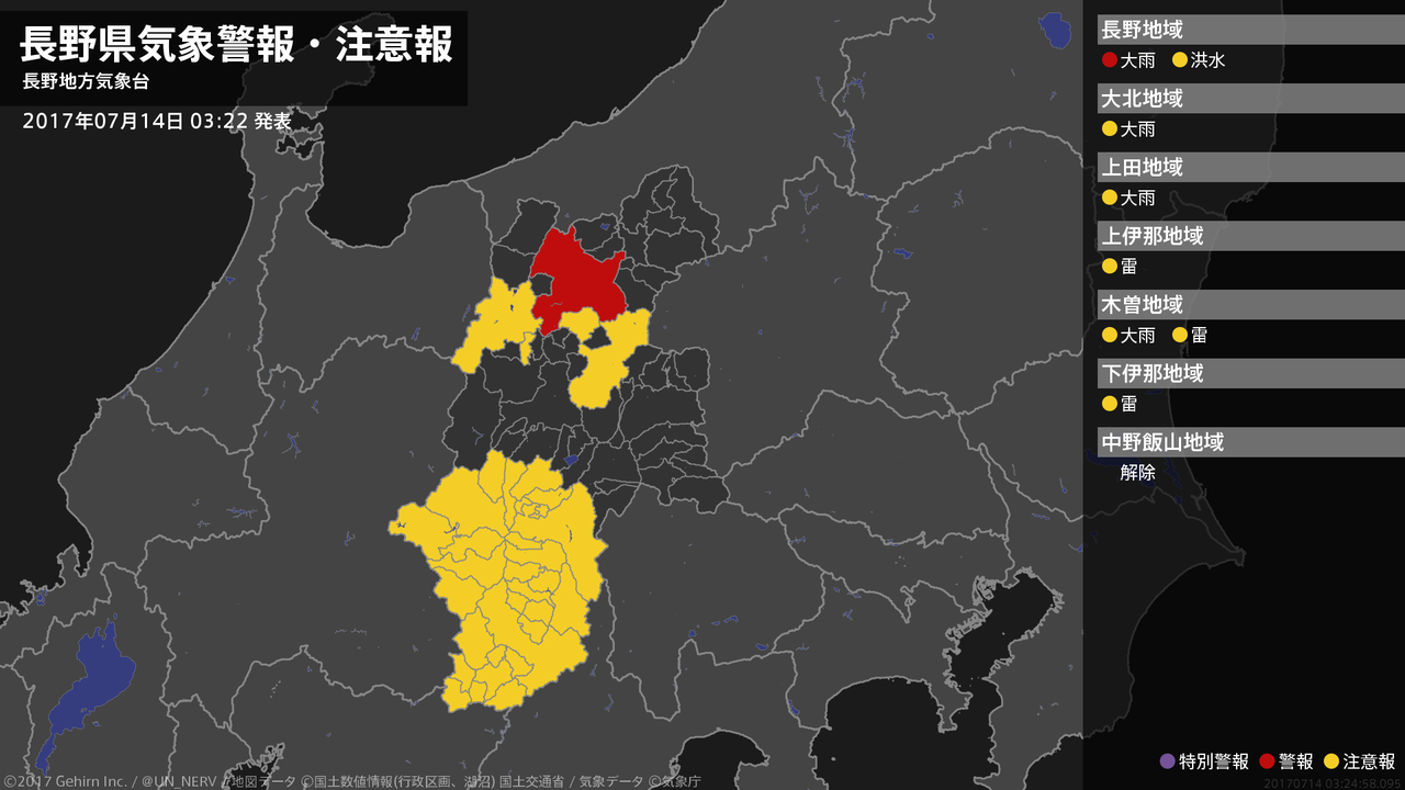 【長野県 気象警報 2017年07月14日 03:24】北部では、14日明け方まで土砂災害に警戒してください。#気象警報 #気象警報注意報 #長野県