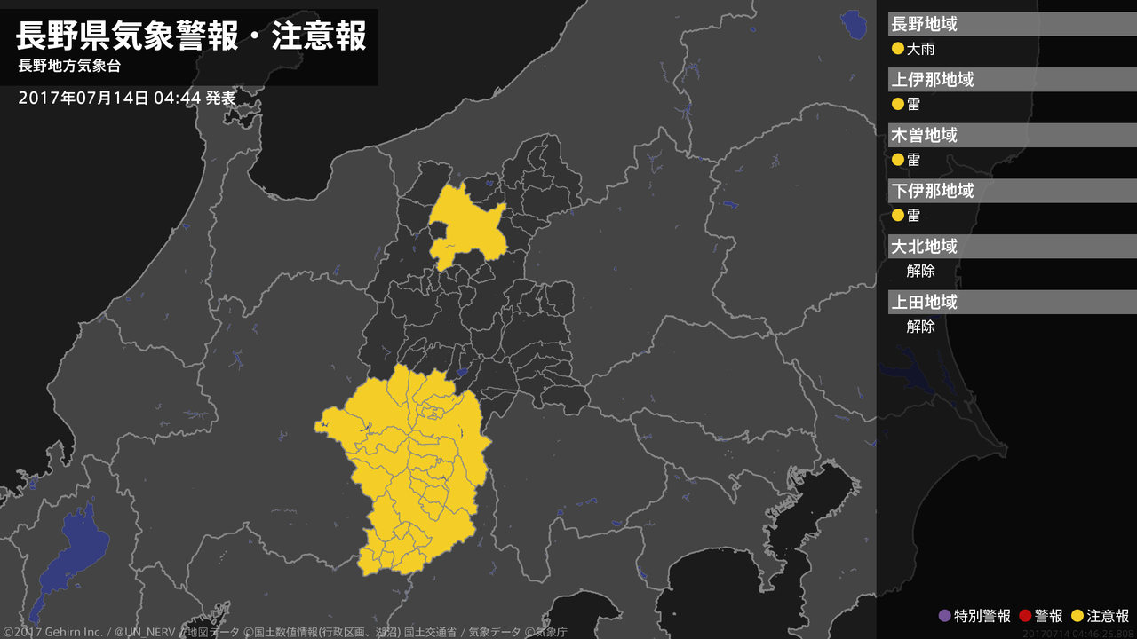 【長野県 気象警報(解除) 2017年07月14日 04:46】長野県に発表されていた気象警報はすべて解除されました。北部では、土砂災害に注意してください。南部では、落雷に注意してください。#気象警報 #長野県