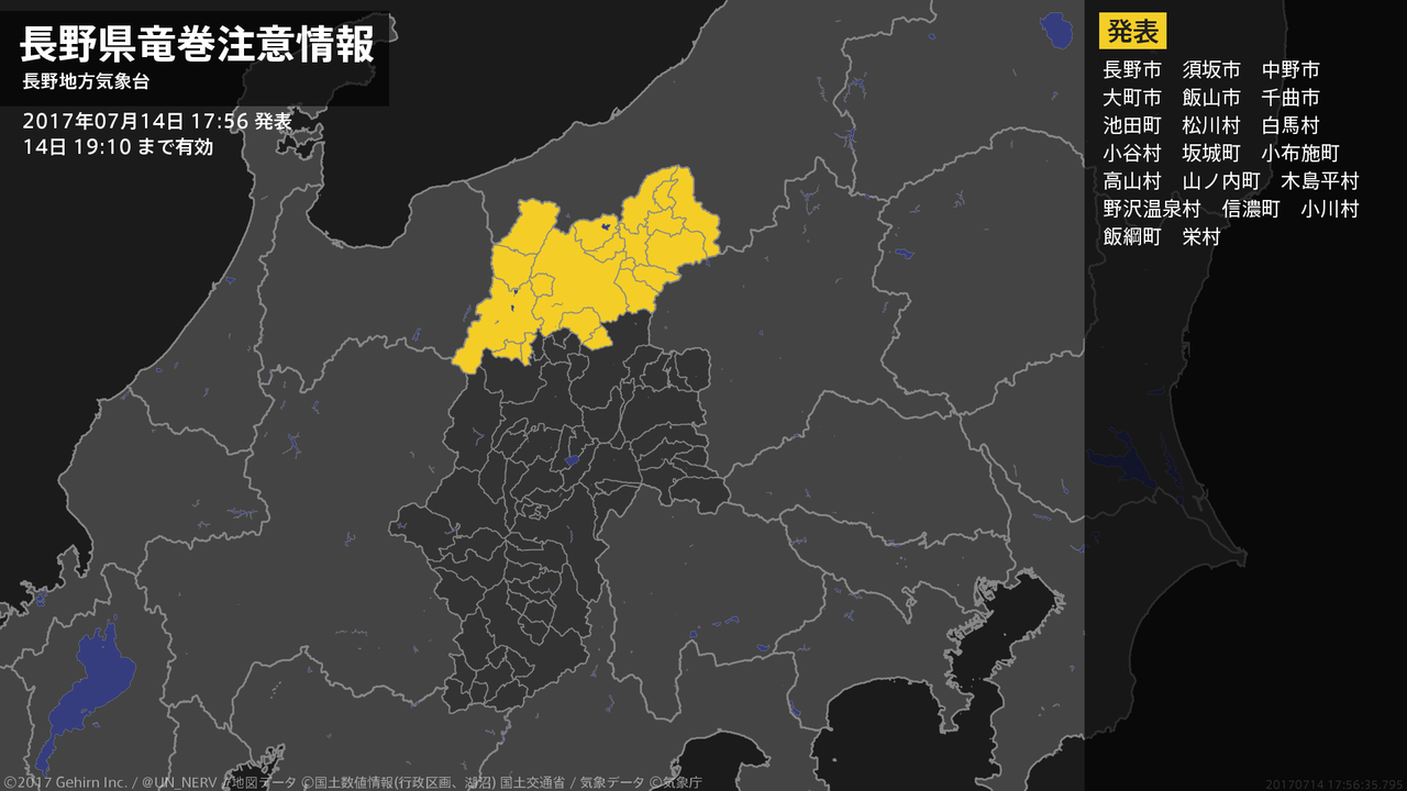 【長野県 気象警報 2017年07月14日 19:09】北部では、14日夜遅くまで土砂災害に警戒してください。#気象警報 #気象警報注意報 #長野県