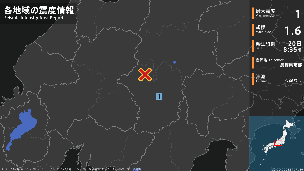 08時35分頃、長野県南部を震源とする地震がありました。震源の深さはごく浅い、地震の規模はM1.6、最大震度1を長野県で観測しています。この地震による津波の心配はありません。