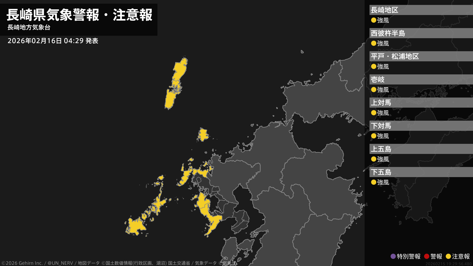【長崎県 気象警報・注意報 2026年02月16日 04:29】五島では16日昼前まで、壱岐・対馬では16日夜遅くまで、南部、北部では17日明け方まで、強風に注意してください。#気象警報注意報 #長崎県
