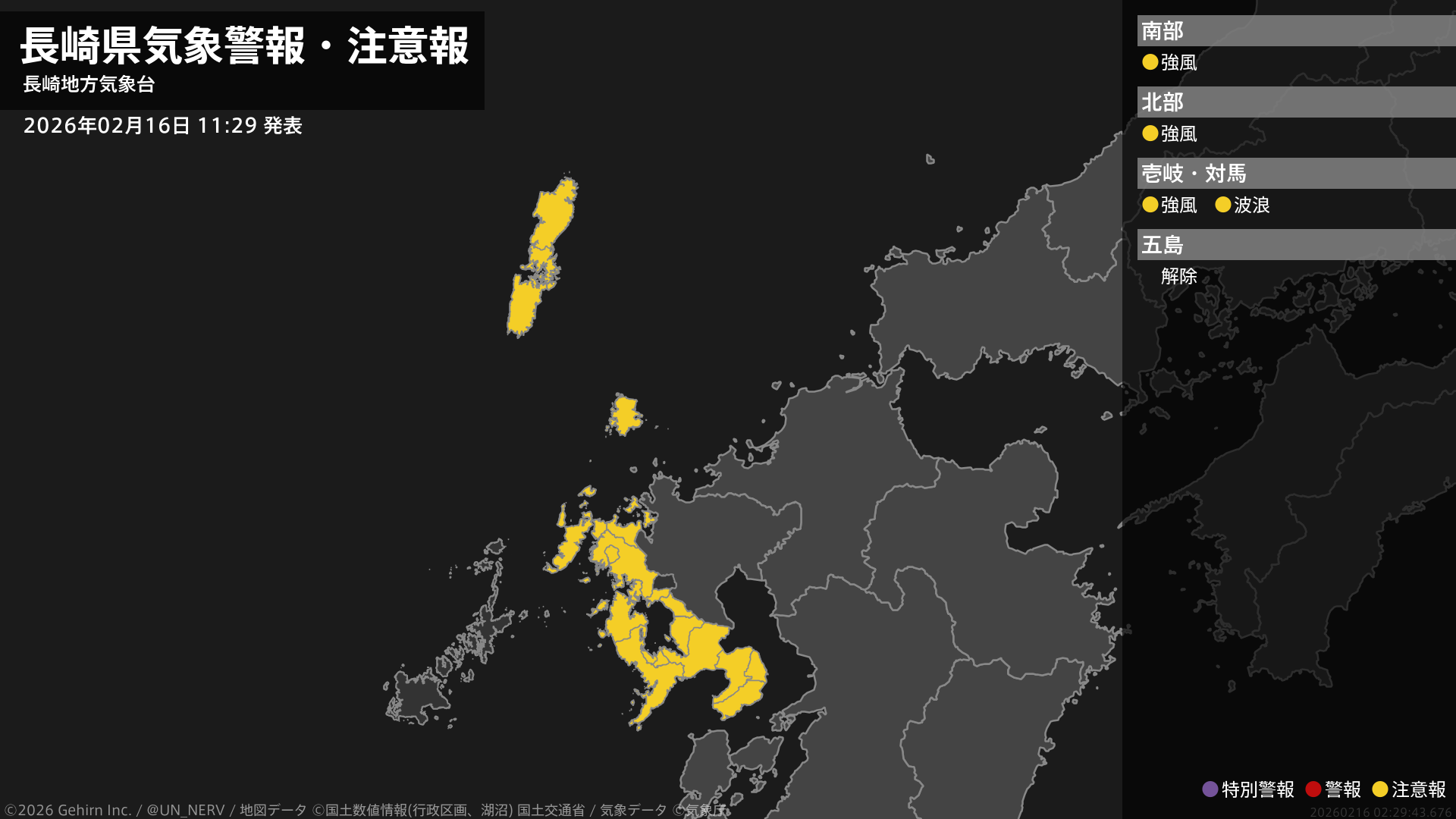 【長崎県 気象警報・注意報 2026年02月15日 03:07】注意報を解除します。#気象警報注意報 #長崎県