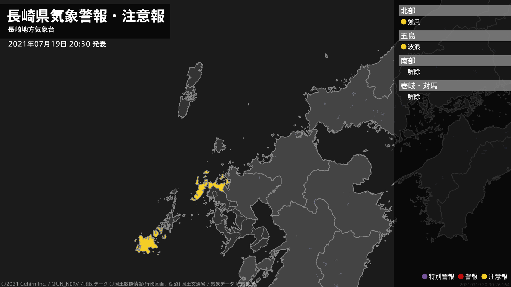 【長崎県 気象警報・注意報 2021年07月19日 20:30】北部では、20日明け方から強風に注意してください。五島では、20日未明から高波に注意してください。#気象警報注意報 #長崎県