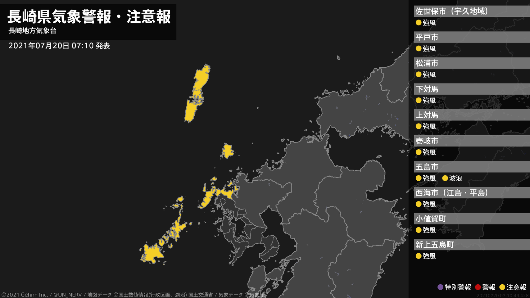 【長崎県 気象警報・注意報 2021年07月20日 07:10】北部、壱岐・対馬、五島では、強風に注意してください。五島では、高波に注意してください。#気象警報注意報 #長崎県