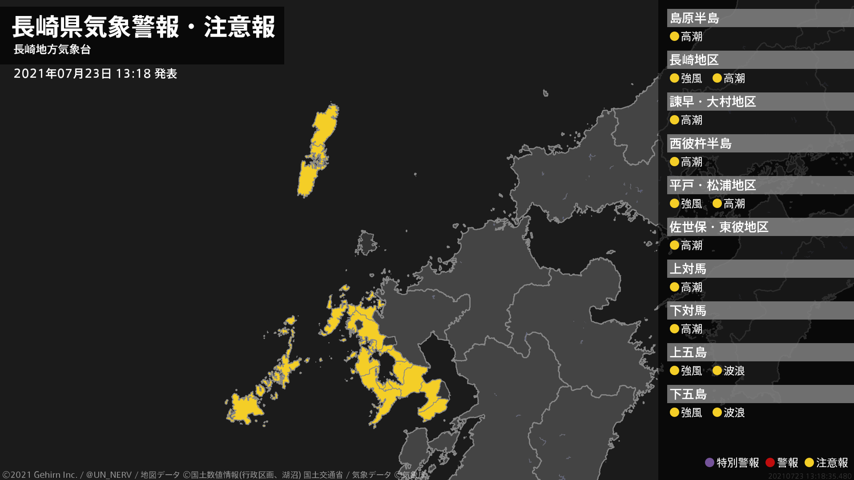 【長崎県 気象警報・注意報 2021年07月23日 13:18】南部、北部、五島では、強風に注意してください。五島では、高波に注意してください。南部、北部、壱岐・対馬では、高潮に注意してください。#気象警報注意報 #長崎県