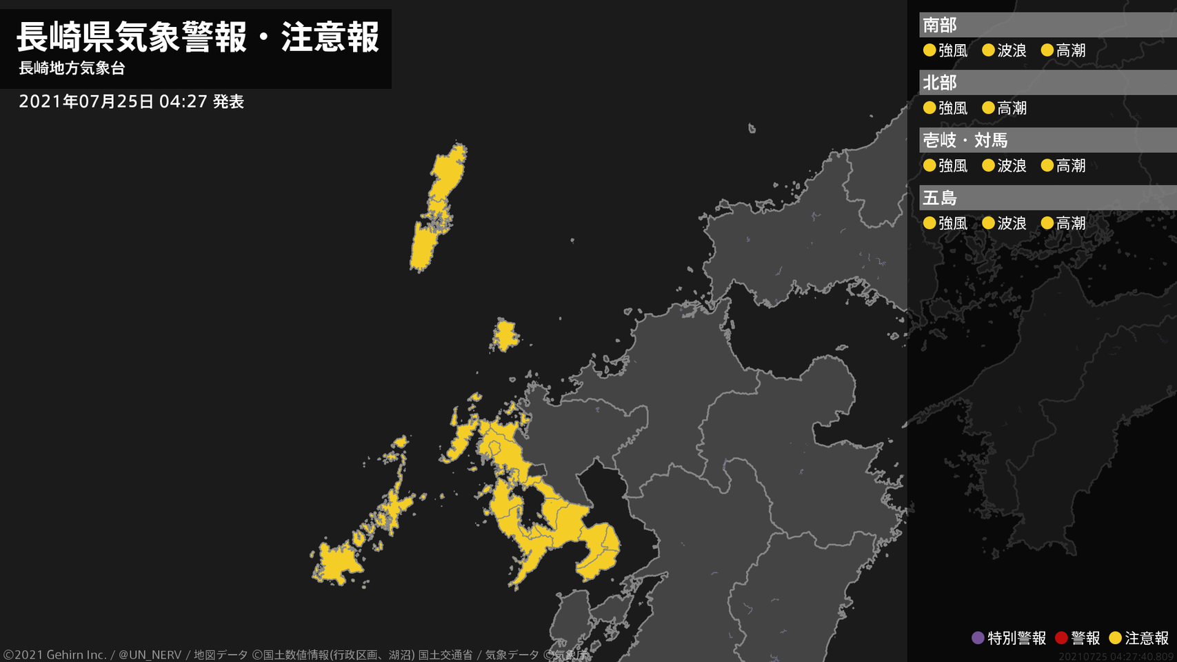 【長崎県 気象警報・注意報 2021年07月25日 15:47】五島では、強風や高波に注意してください。長崎県では、高潮に注意してください。#気象警報注意報 #長崎県