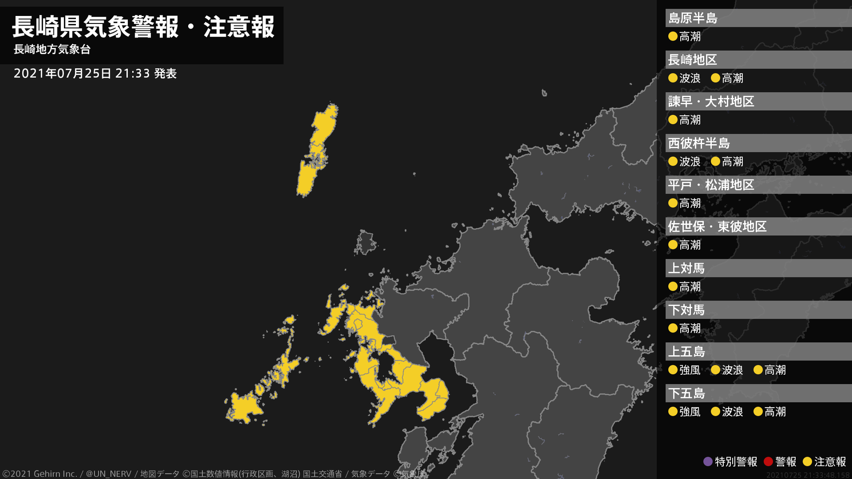 【長崎県 気象警報・注意報 2021年07月25日 21:33】五島では、強風に注意してください。南部、五島では、高波に注意してください。長崎県では、高潮に注意してください。#気象警報注意報 #長崎県