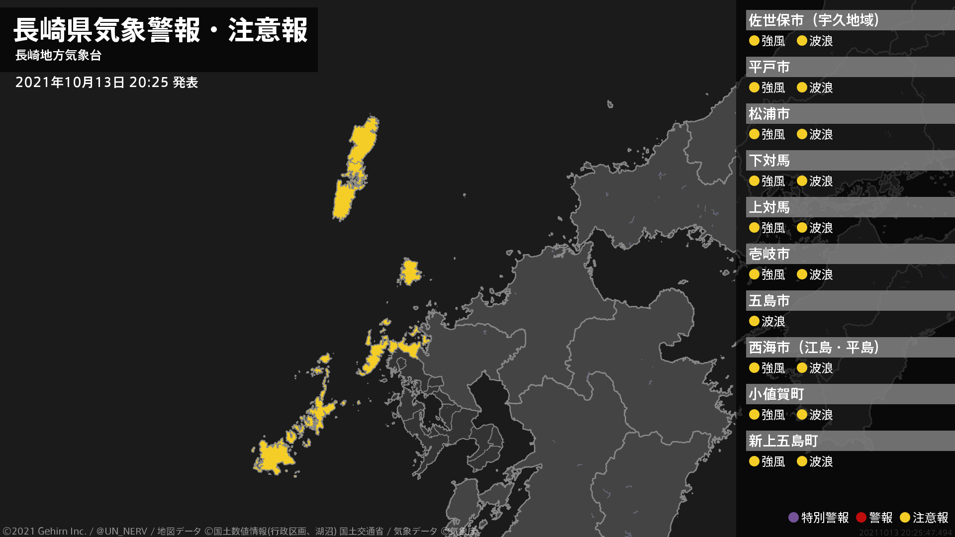 【長崎県 気象警報・注意報 2021年10月13日 20:25】北部、壱岐・対馬、五島では、14日朝まで強風や高波に注意してください。#気象警報注意報 #長崎県