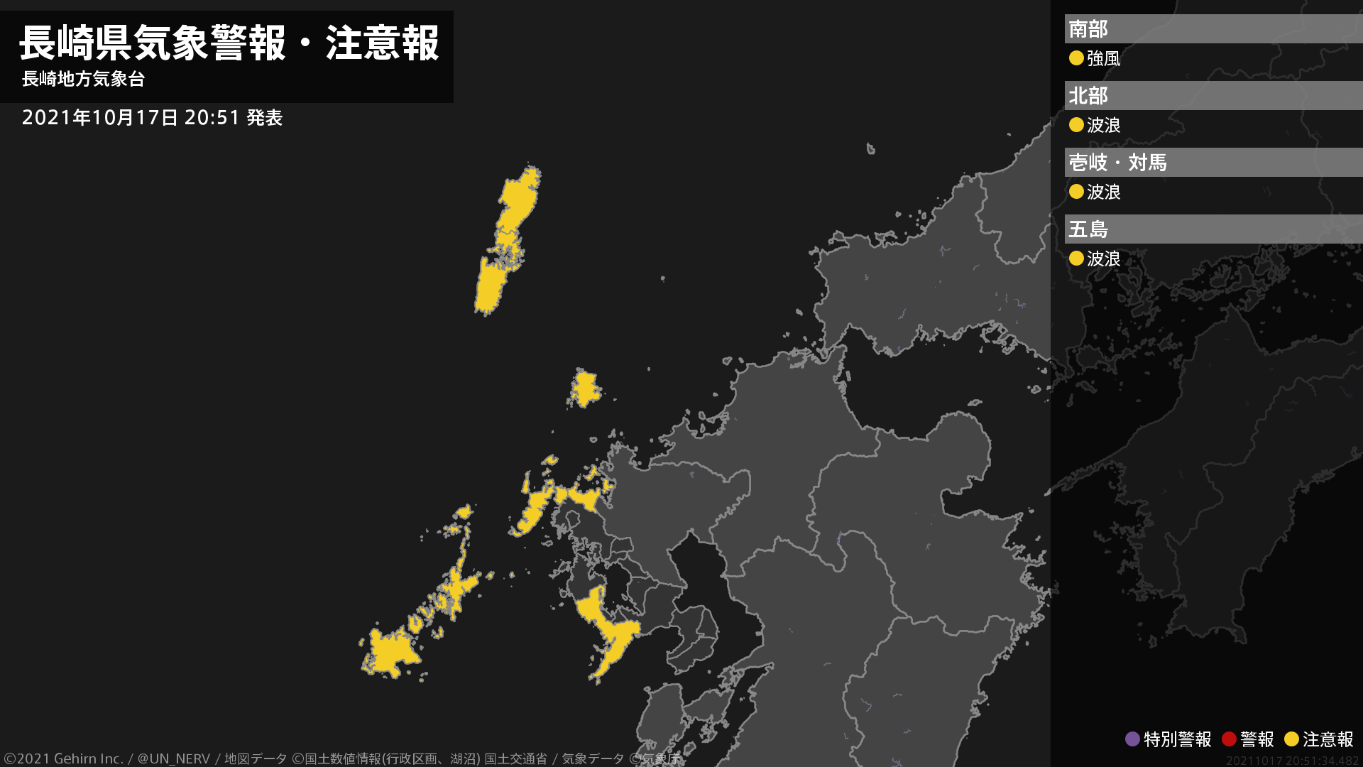 【長崎県 気象警報・注意報 2021年10月17日 20:51】南部では、18日明け方まで強風に注意してください。北部、壱岐・対馬、五島では、18日明け方まで高波に注意してください。#気象警報注意報 #長崎県