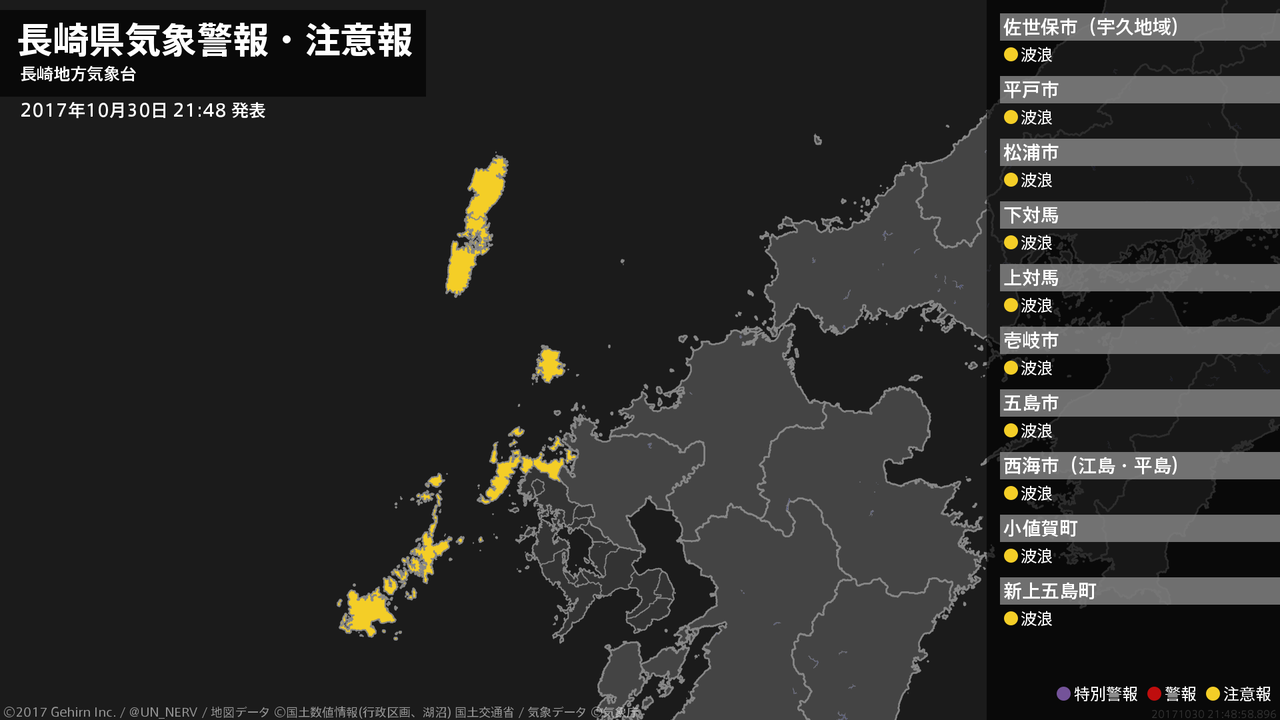 【長崎県 気象警報・注意報 2017年10月30日 21:49】