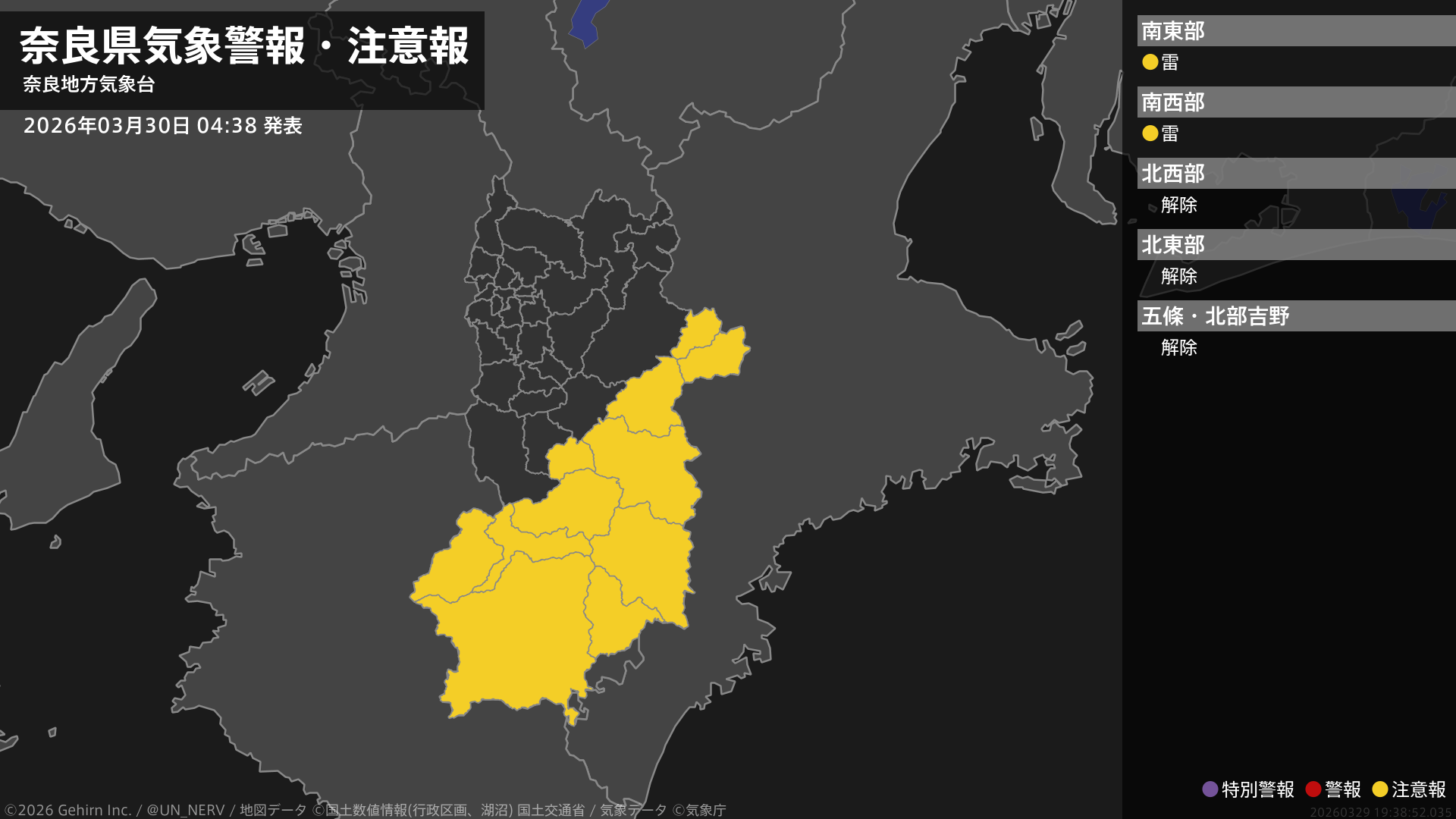 【奈良県 気象警報・注意報 2026年03月30日 04:38】南部では、30日昼前まで急な強い雨や落雷に注意してください。#気象警報注意報 #奈良県