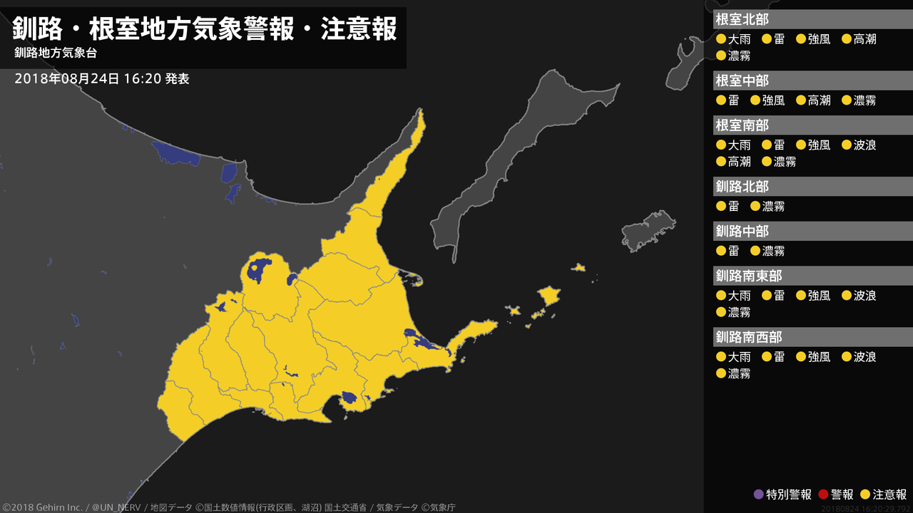 【釧路・根室地方 気象警報・注意報 2018年08月24日 16:20】根室、釧路地方では、土砂災害や低い土地の浸水、強風、高波、落雷、濃霧による視程障害に注意してください。根室地方では、高潮に注意してください。#気象警報注意報 #根室地方 #釧路地方