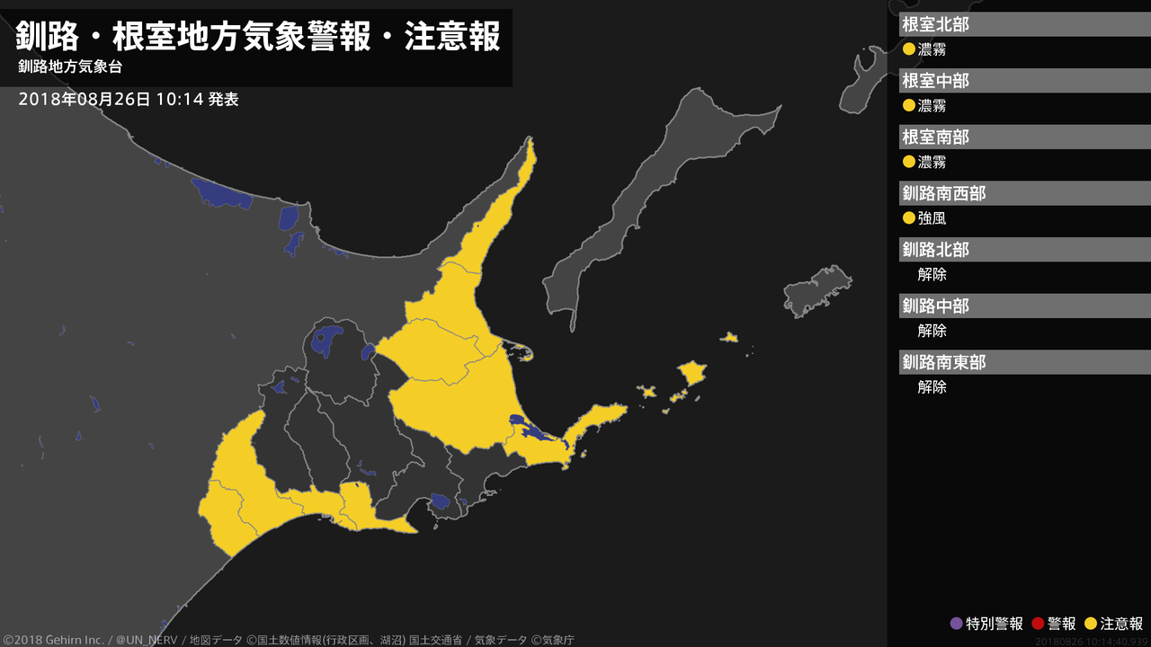 【釧路・根室地方 気象警報・注意報 2018年08月26日 10:14】釧路地方では、26日夕方まで強風に注意してください。根室地方では、27日昼前まで濃霧による視程障害に注意してください。#気象警報注意報 #根室地方 #釧路地方