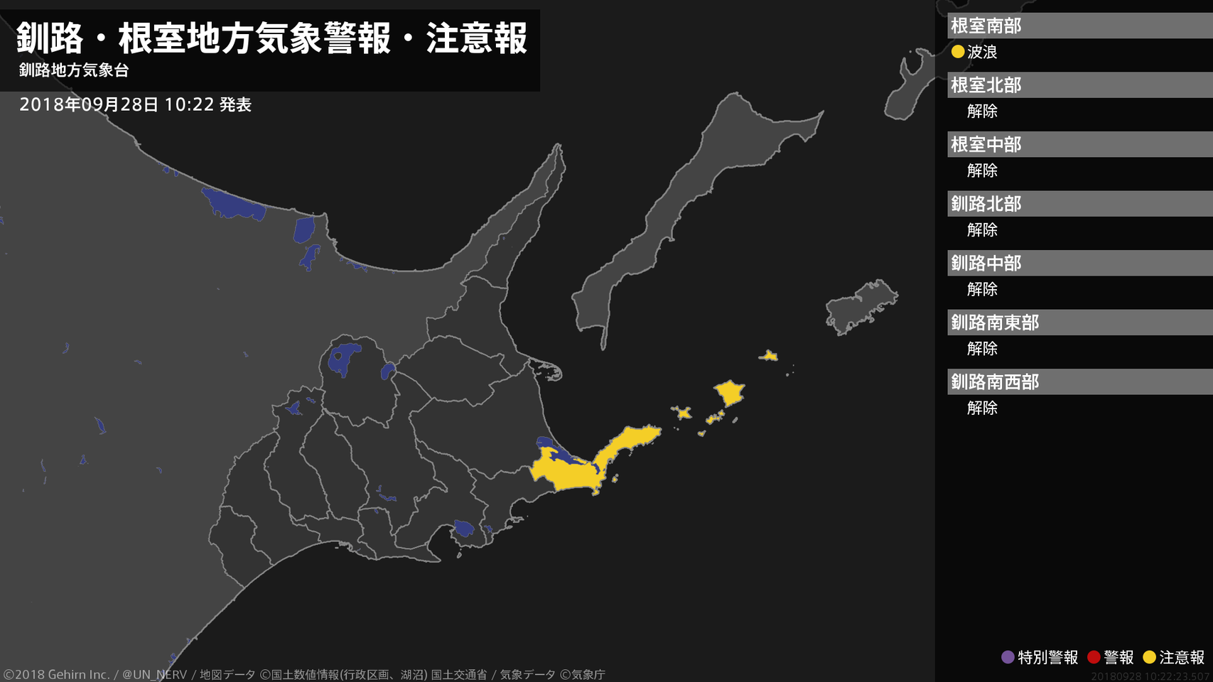 【釧路・根室地方 気象警報・注意報 2018年09月30日 16:32】根室、釧路地方では、土砂災害や強風、高波、落雷、濃霧による視程障害に注意してください。#気象警報注意報 #根室地方 #釧路地方