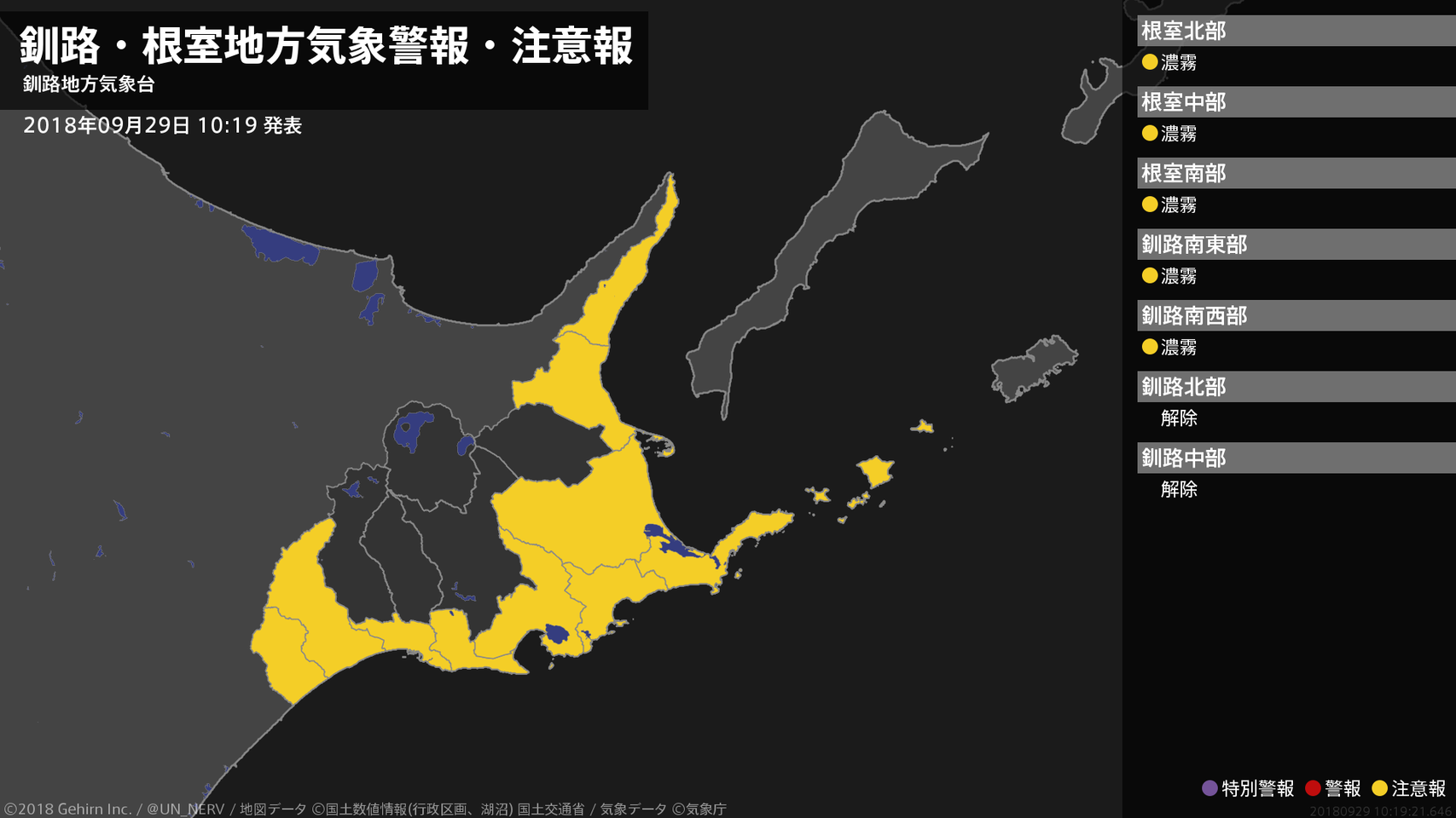 【釧路・根室地方 気象警報・注意報 2018年09月29日 02:23】根室、釧路地方では、29日昼前まで濃霧による視程障害に、29日朝は霜に対する農作物の管理に注意してください。#気象警報注意報 #根室地方 #釧路地方