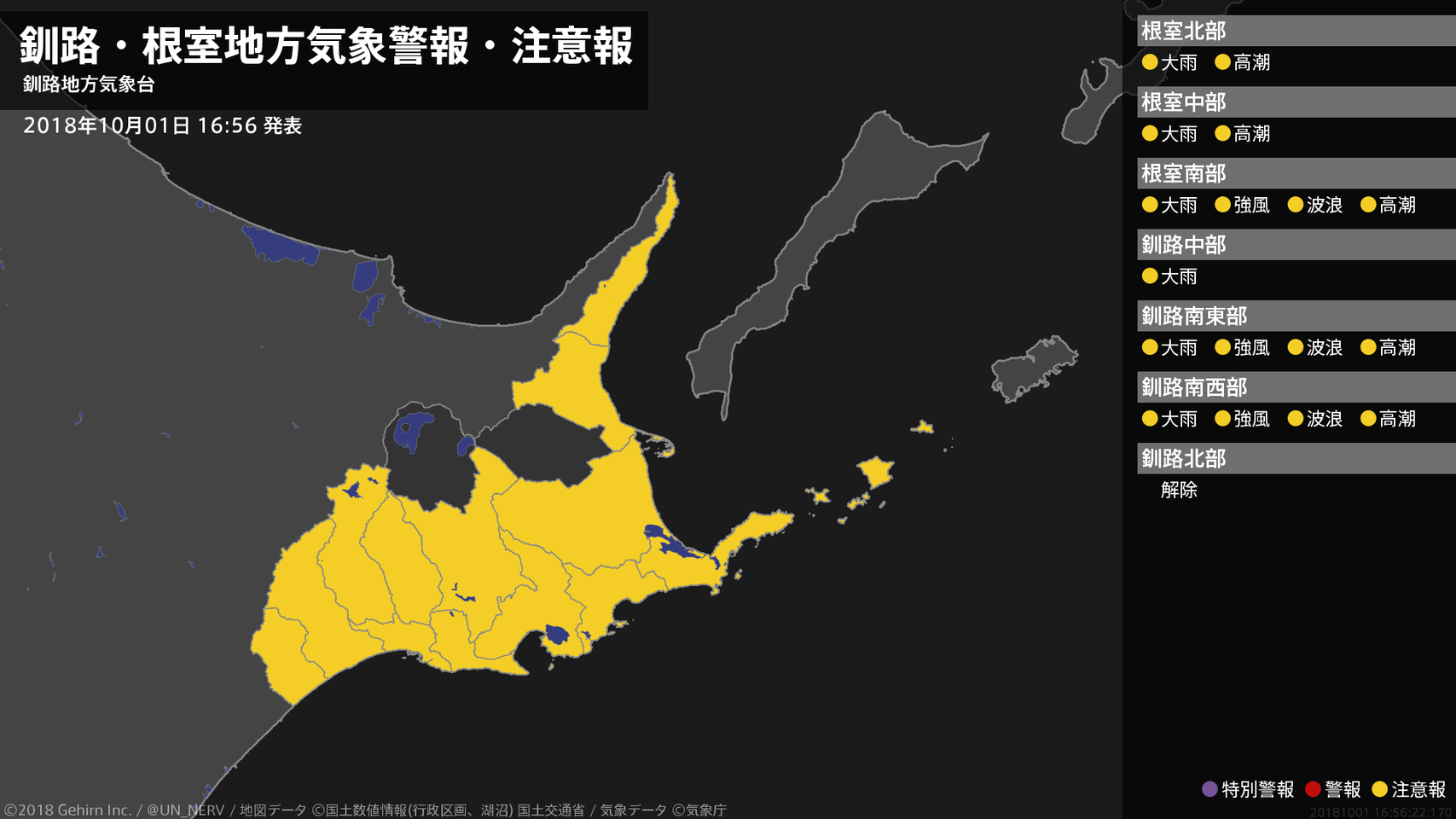 【釧路・根室地方 気象警報(解除) 2018年10月01日 13:10】釧路・根室地方に発表されていた気象警報はすべて解除されました。#気象警報 #根室地方 #釧路地方