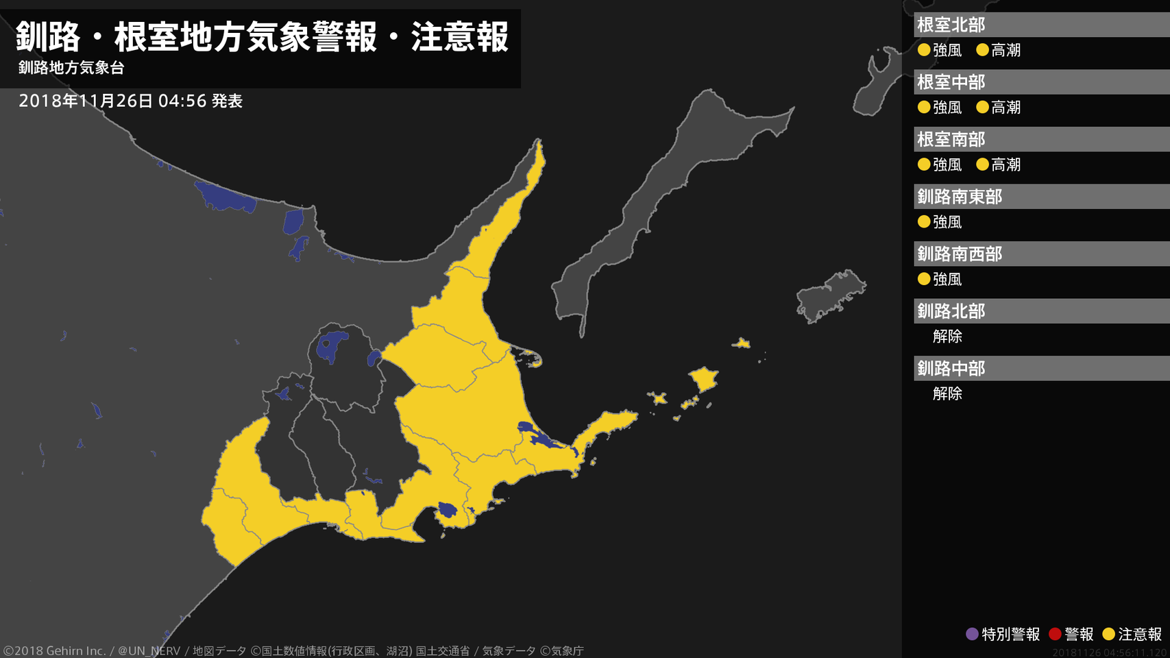 【釧路・根室地方 気象警報・注意報 2018年11月26日 04:56】根室、釧路地方では、26日昼前まで強風に注意してください。根室地方では、26日昼過ぎから26日夕方まで高潮に注意してください。#気象警報注意報 #根室地方 #釧路地方