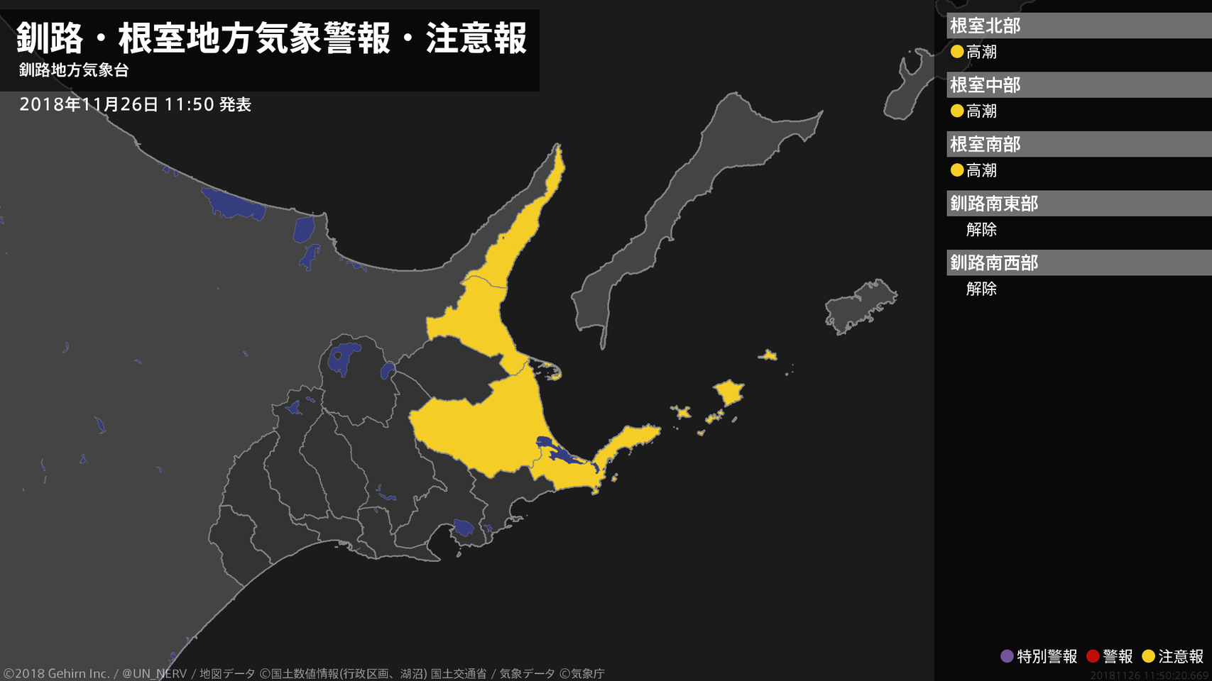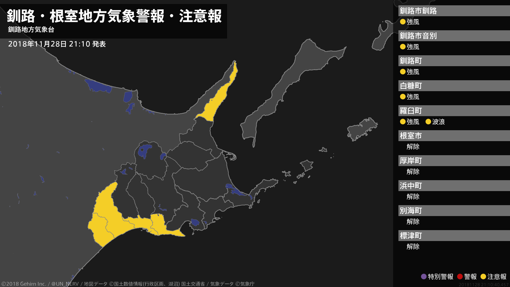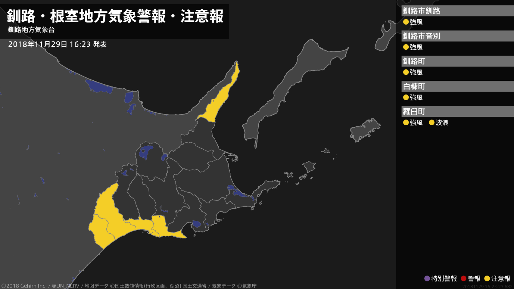 【釧路・根室地方 気象警報・注意報 2018年11月30日 16:07】注意報を解除します。#気象警報注意報 #根室地方