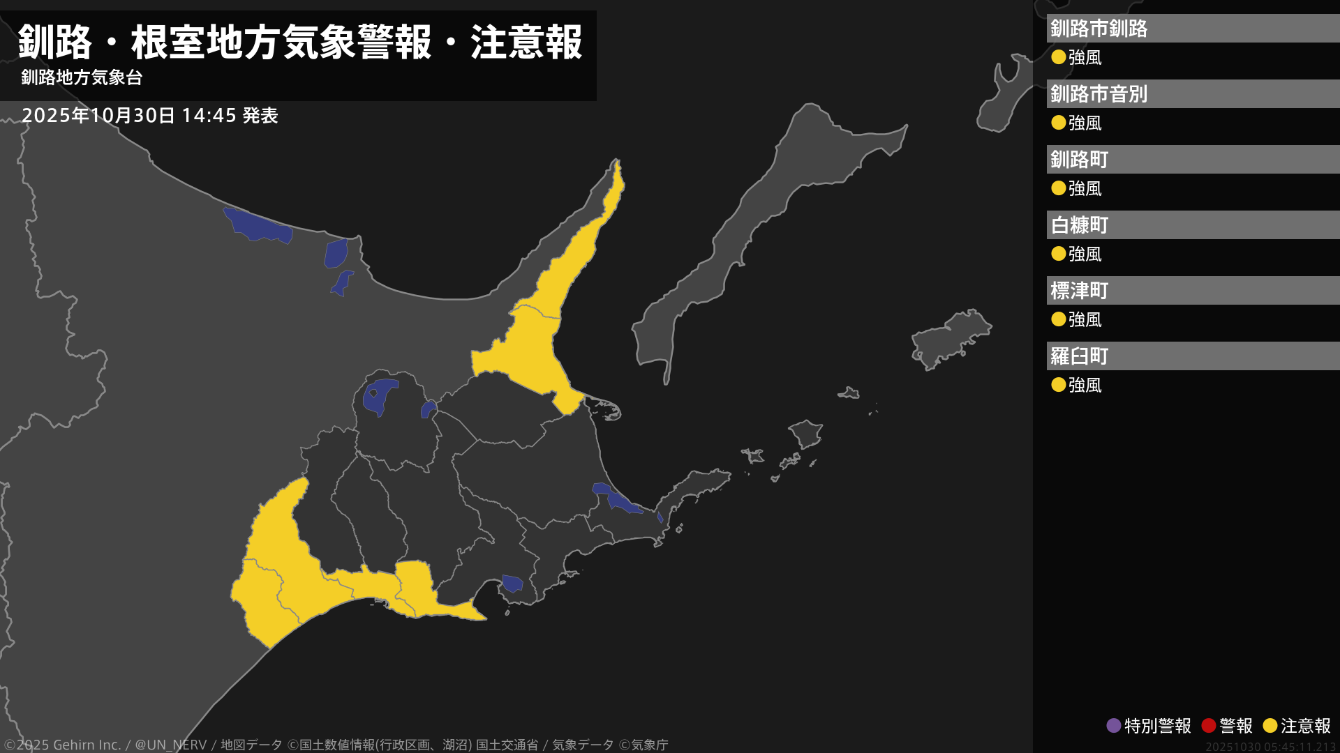 北日本では11月1日は暴風や高波に警戒し、北海道地方では高潮による低い土地の浸水に、東日本では高波に注意・警戒してください。また、東日本と北日本では1日にかけて、土砂災害、低い土地の浸水、河川の増水に注意・警戒し、全国的に落雷や竜巻などの激しい突風、降ひょうに注意してください。