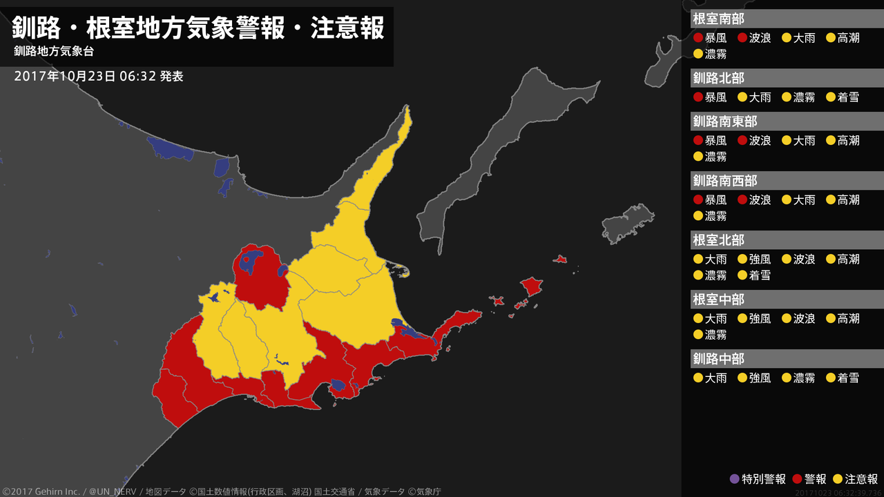 【釧路・根室地方 気象警報・注意報 2017年10月23日 03:31】根室、釧路地方では、土砂災害や強風、高波、高潮、濃霧による視程障害に注意してください。#気象警報注意報 #根室地方 #釧路地方