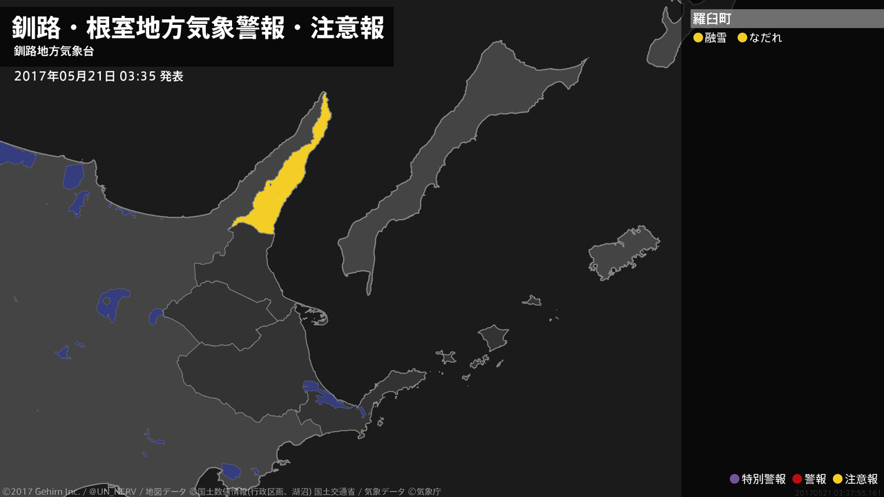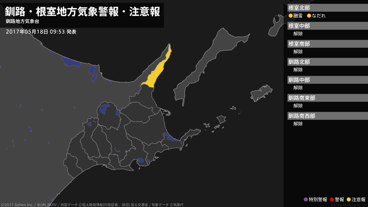 【釧路・根室地方 気象警報・注意報 2017年05月21日 03:37】根室地方では、融雪やなだれに注意してください。#気象警報注意報 #根室地方