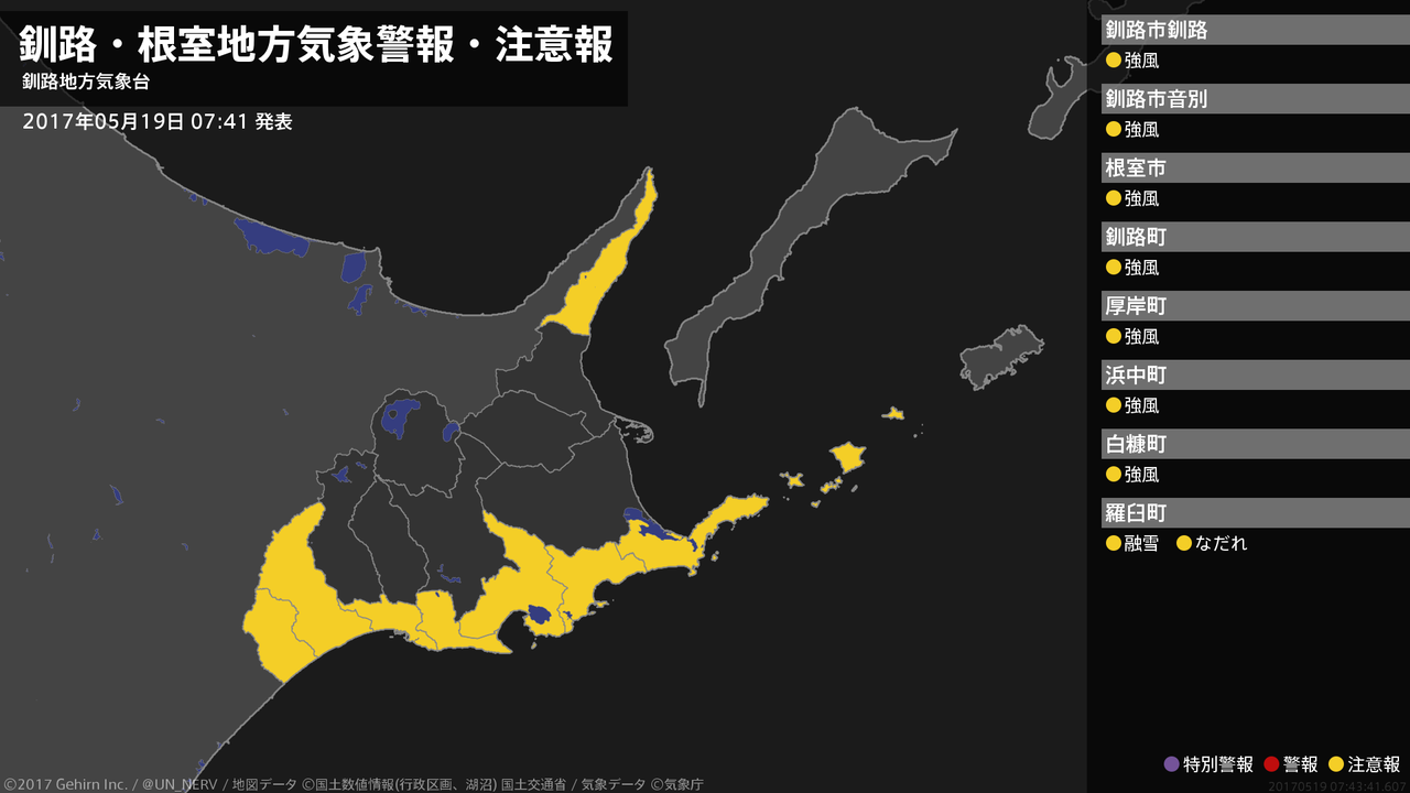 【釧路・根室地方 気象警報・注意報 2017年05月19日 07:43】根室、釧路地方では、強風に注意してください。根室地方では、融雪やなだれに注意してください。#気象警報注意報 #根室地方 #釧路地方