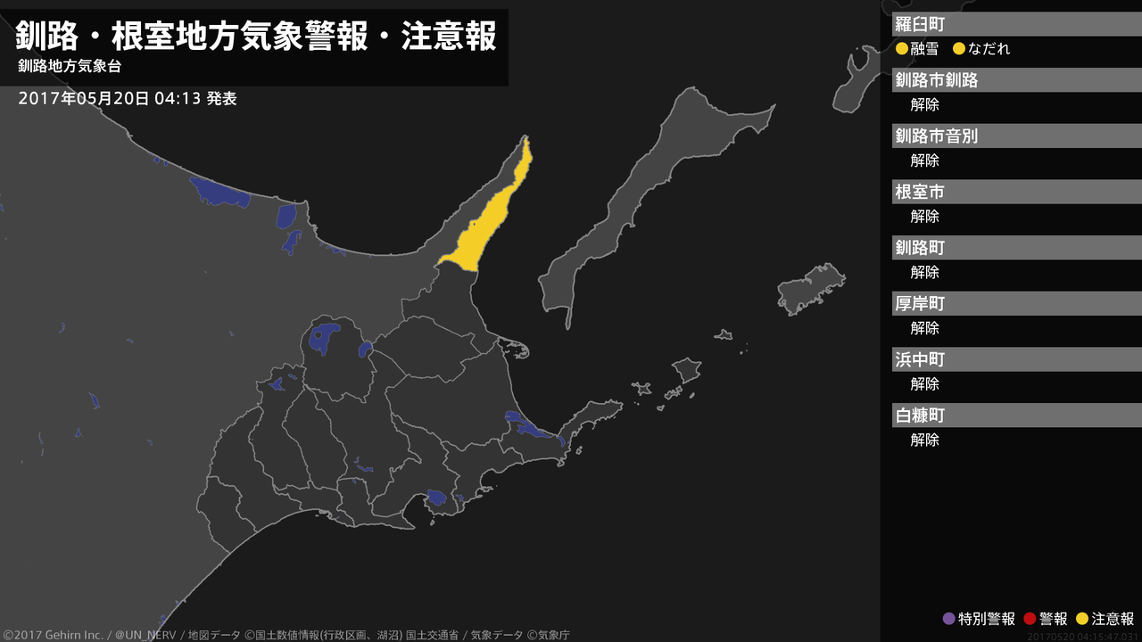 【釧路・根室地方 気象警報・注意報 2017年05月20日 04:15】根室地方では、融雪やなだれに注意してください。#気象警報注意報 #根室地方 #釧路地方
