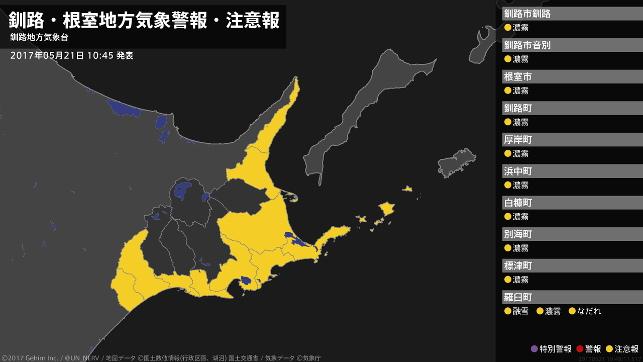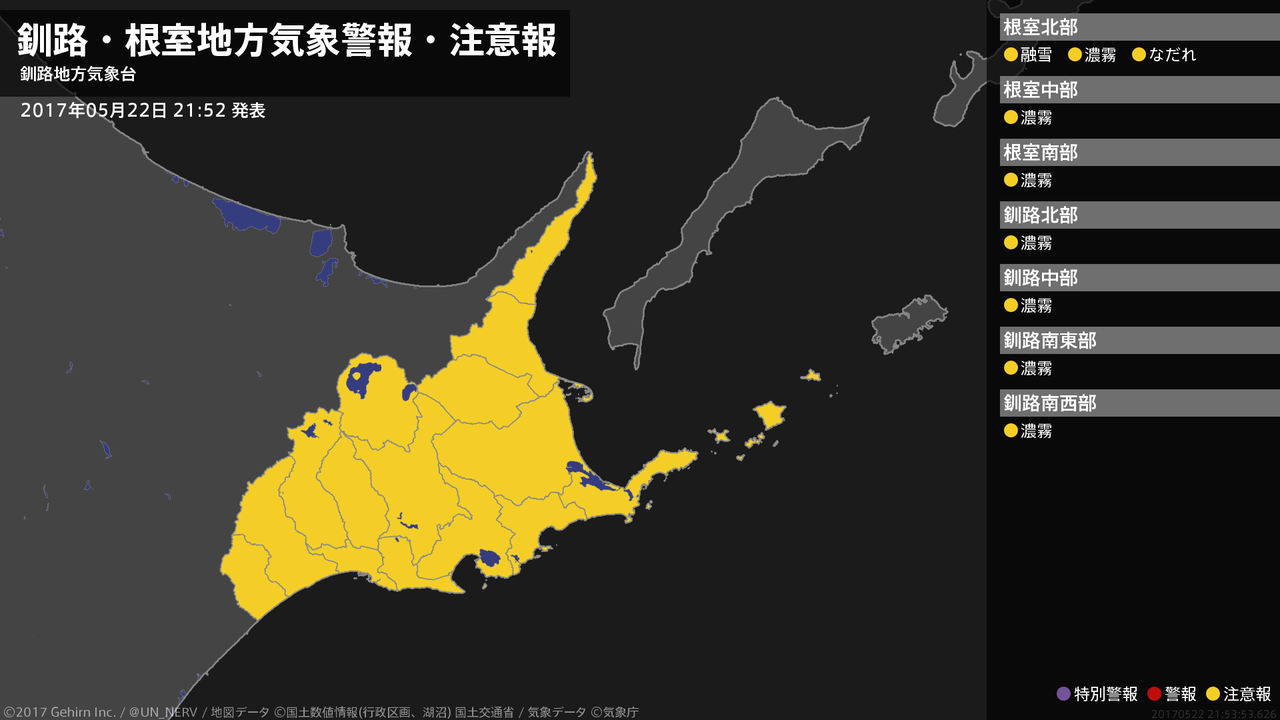 【釧路・根室地方 気象警報・注意報 2017年05月21日 21:16】根室地方では、融雪やなだれに注意してください。根室、釧路地方では、濃霧による視程障害に注意してください。#気象警報注意報 #根室地方 #釧路地方