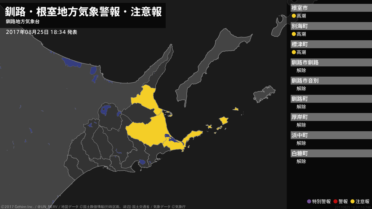 【釧路・根室地方 気象警報・注意報 2017年08月25日 18:37】