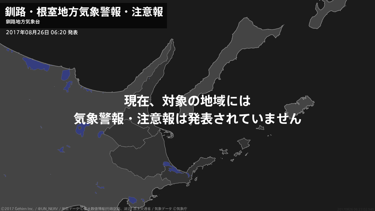 【釧路・根室地方 気象警報・注意報 2017年08月26日 06:23】