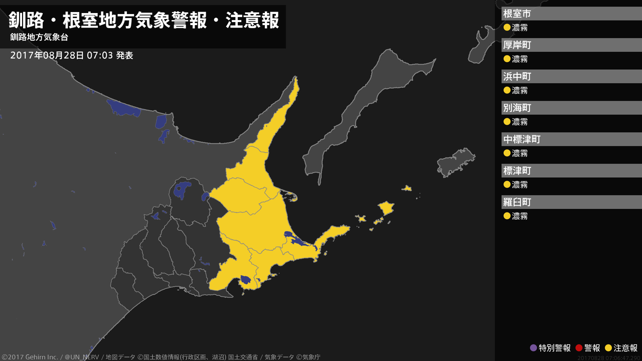 【釧路・根室地方 気象警報・注意報 2017年08月28日 07:06】