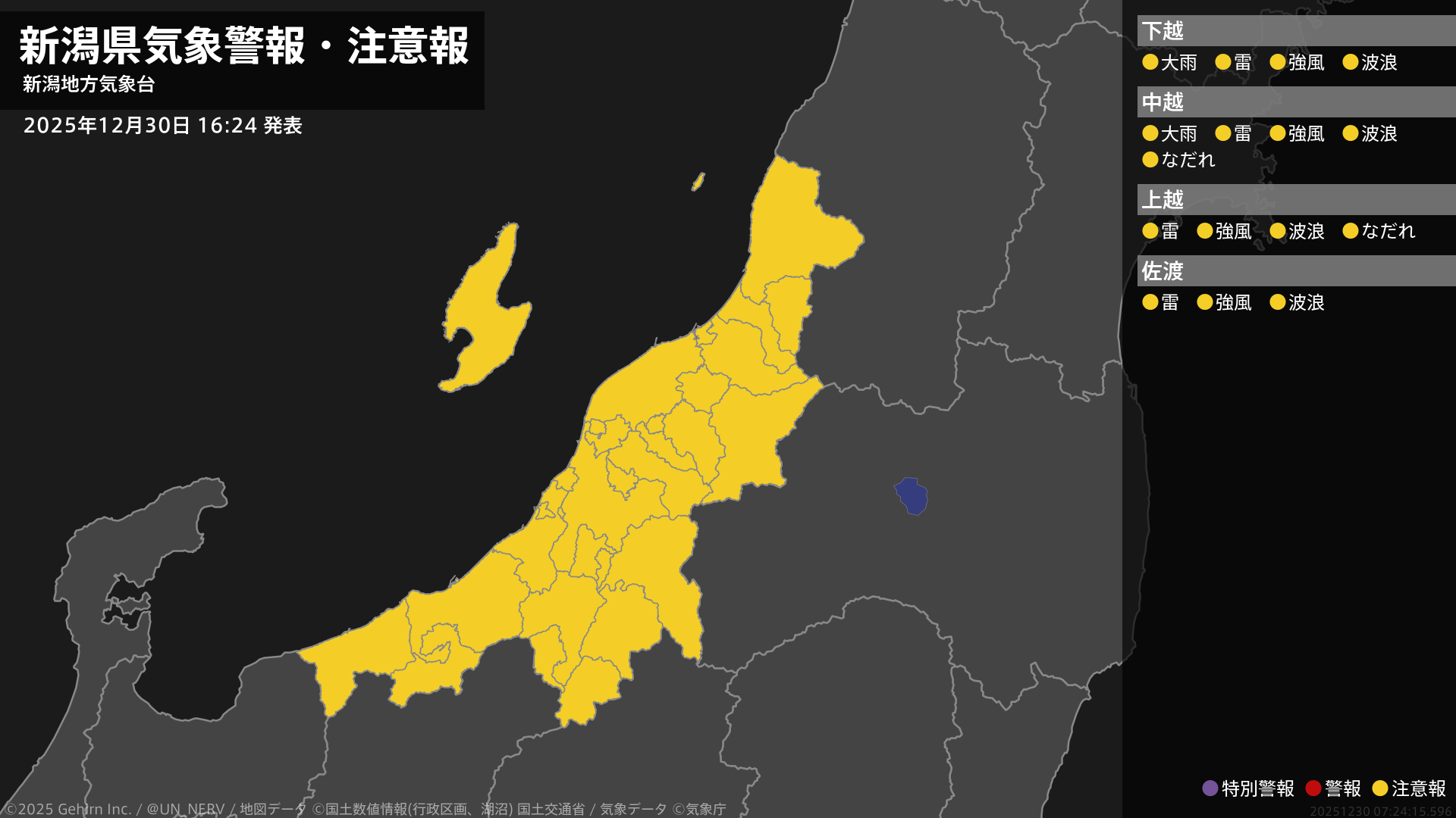 【新潟県 気象警報・注意報 2025年12月30日 16:24】下越、中越では、土砂災害に注意してください。新潟県では、強風や高波、竜巻などの激しい突風、落雷に注意してください。中越、上越では、なだれに注意してください。#気象警報注意報 #新潟県