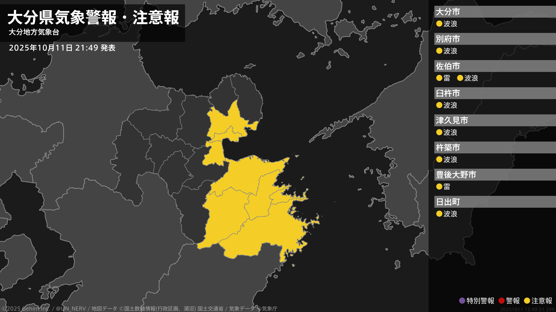 【大分県 気象警報・注意報 2025年10月11日 21:49】