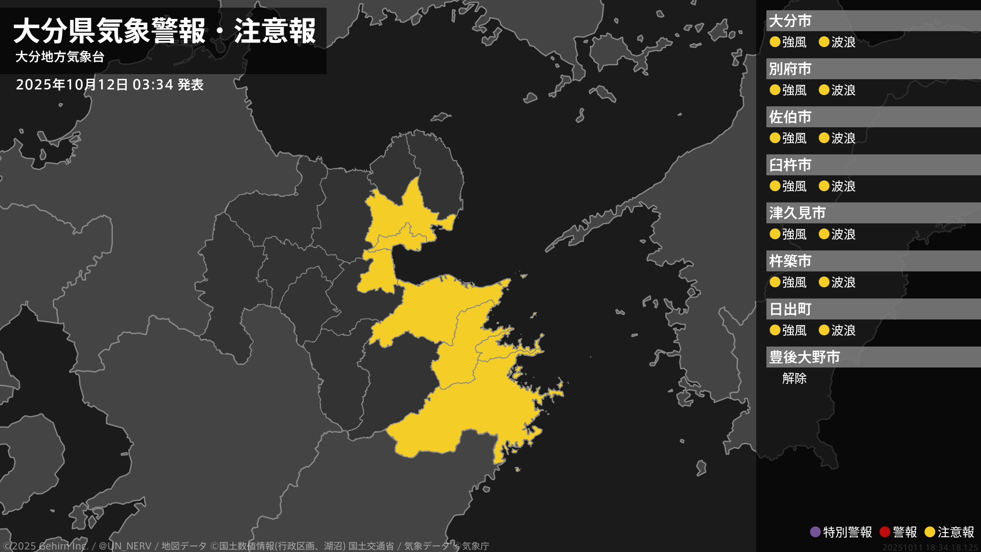【大分県 気象警報・注意報 2025年10月12日 03:34】