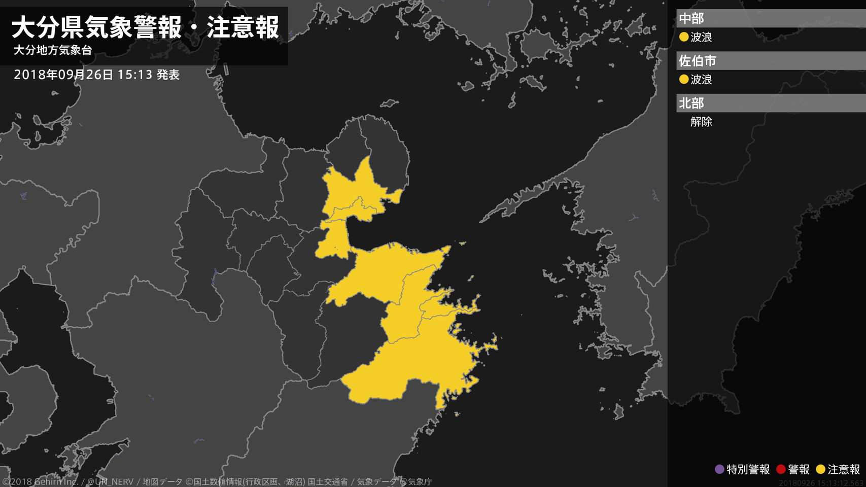 【大分県 気象警報・注意報 2018年09月26日 15:13】中部、南部では、高波に注意してください。#気象警報注意報 #大分県