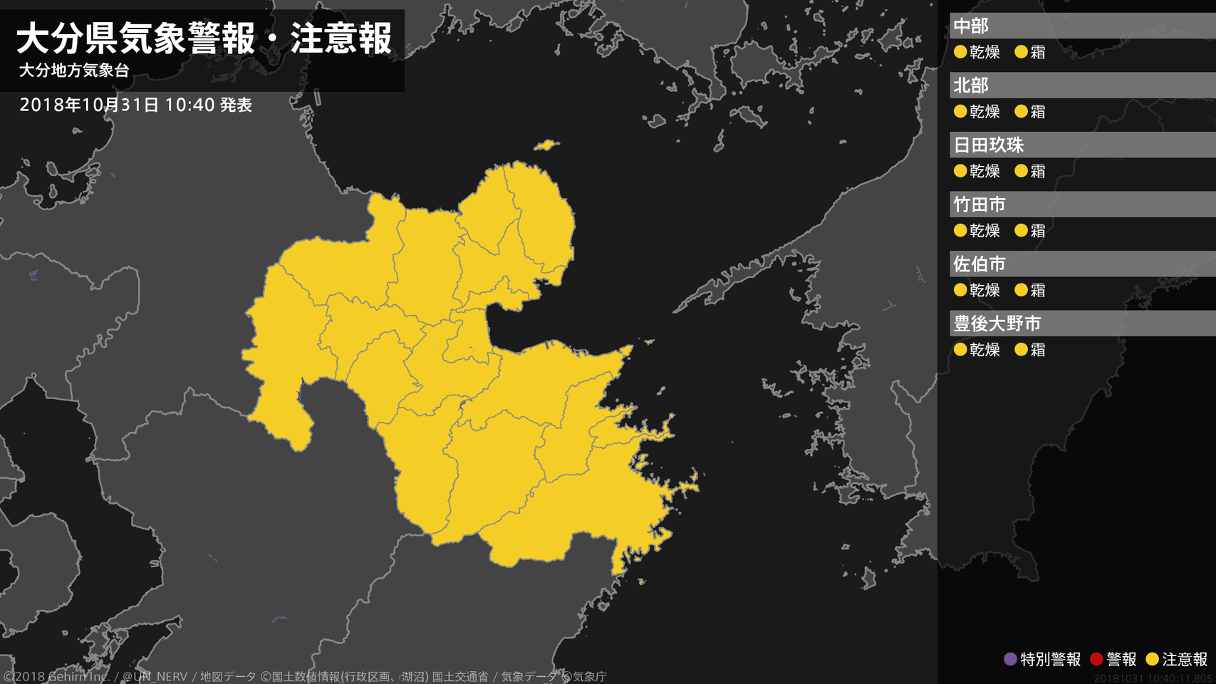 【大分県 気象警報・注意報 2018年10月31日 10:40】大分県では、ここしばらく空気の乾燥による火の取り扱いに、1日朝は霜に対する農作物の管理に注意してください。#気象警報注意報 #大分県